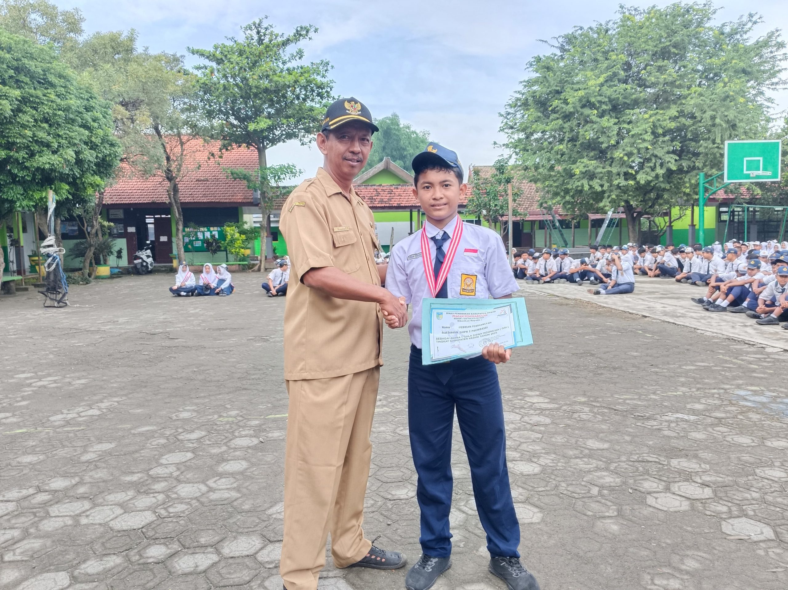 Purwoasri, 26 Mei 2025 – Pagi ini, suasana di SMP Negeri 2 Purwoasri terasa berbeda dari biasanya. Setelah melaksanakan upacara bendera rutin hari Senin, sekolah menggelar acara pembagian piagam penghargaan, trofi, dan hadiah untuk para siswa berprestasi. Suara tepuk tangan pun menggema saat satu per satu nama siswa dan kelas disebutkan untuk maju ke depan menerima piagam penghargaan, trofi, dan hadiah. Bapak Ibu Guru pun ikut bangga melihat prestasi anak didiknya.