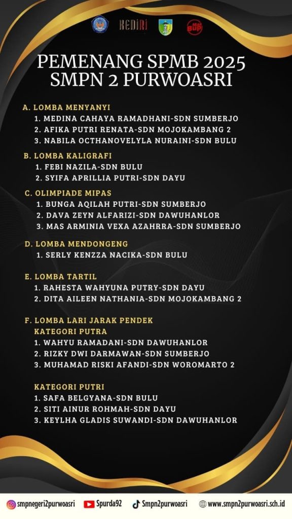 Dengan bangga kami umumkan para pemenang SPMB Jalur Lomba 2025 SMPN 2 Purwoasri . Setelah melalui proses penilaian yang ketat, berikut adalah nama-nama siswa yang berhasil meraih hasil terbaik: